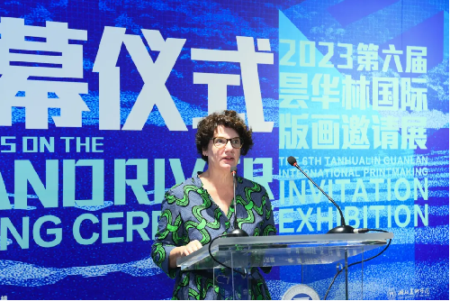 美国艺术家谢丽尔·霍茨伯格女士代表外籍艺术带来观澜原创版画基地国际艺术家的问候,她对观澜版画基地以及“大江·观澜”-第六届昙华林国际版画邀请展”所提供的机会与支持表示了衷心的感谢,为能来到武汉参加这一版画界的盛宴感到十分荣幸,并再次感谢中国人民的友谊与热情款待。