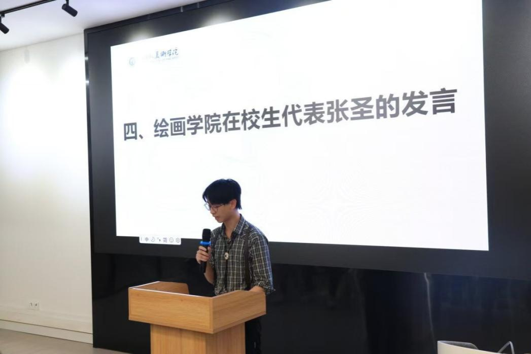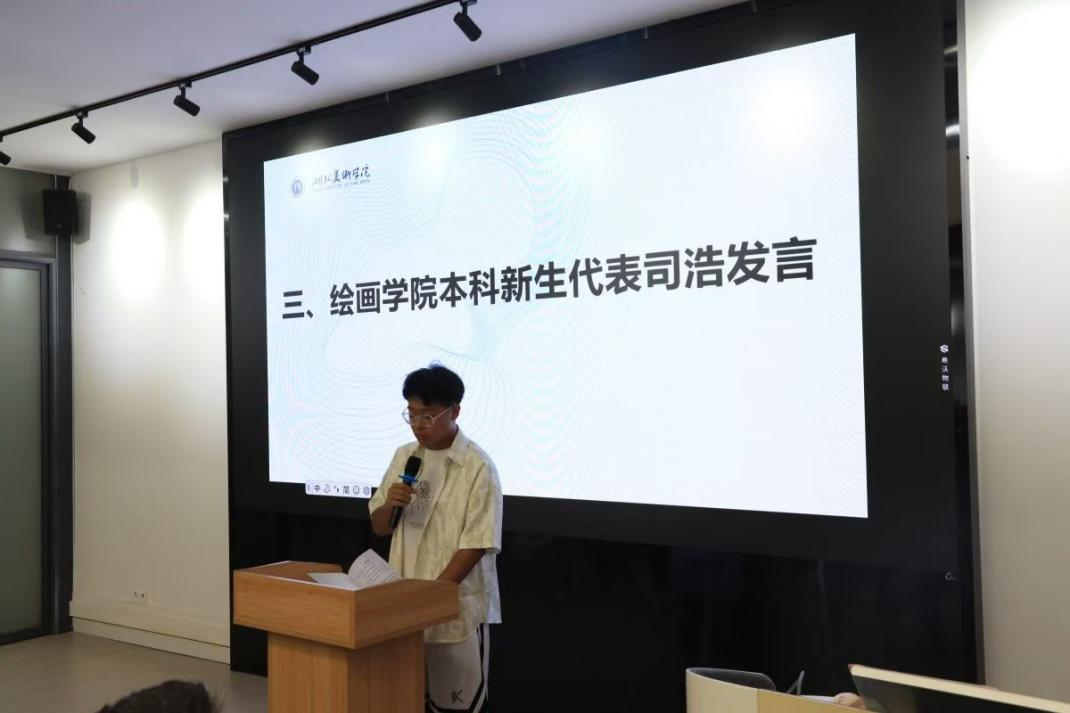 在校生代表张圣的向新生分享了自己学业上的经验和体会,鼓励新同学们相互学习,结识来自不同地区不同专业的同学,提升知识储备,追寻自己的艺术梦想。