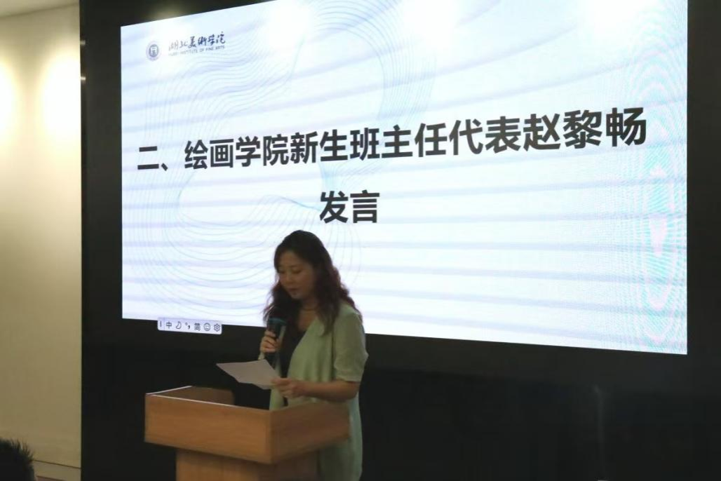 随后新生班主任代表赵黎畅建议新生加强专业学习,拓宽视野;找到志同道合的同行者,互相分享喜悦分担困扰,在探讨中取得进步;保持对艺术的热爱,保持好奇心和求知欲,关注社会,用艺术的力量温暖人心,洗涤智慧,收获成长进步。