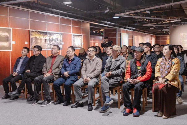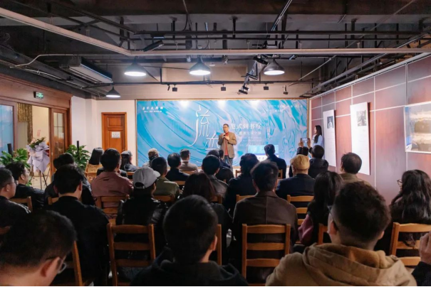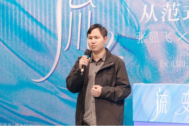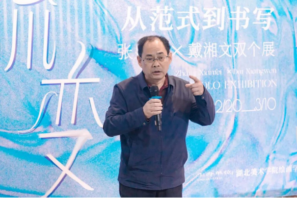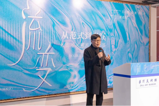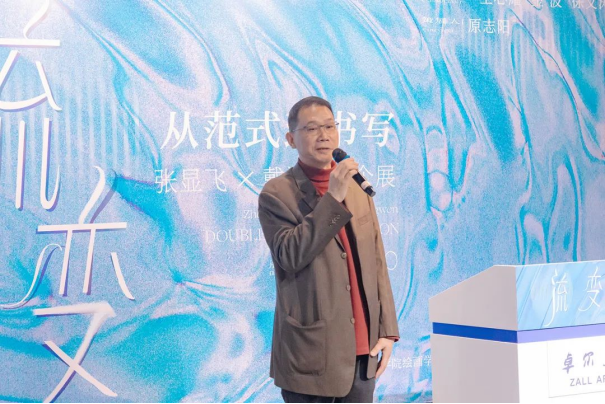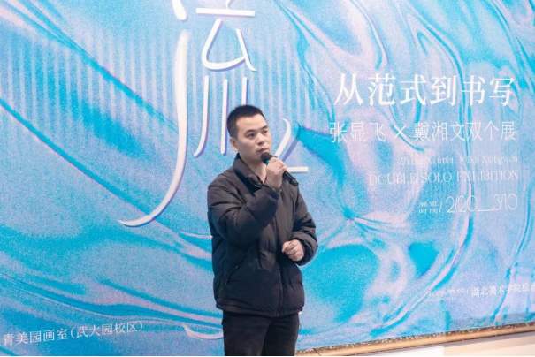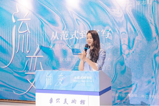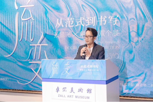 策展人原志阳解析了两位艺术家作品中传统符号与现代语境的碰撞与交融。他认为,张显飞从写实到一种个体的书写,戴湘文对山水进行新的叙事、消解与再构,两人风格迥异,但都在各自的领域内探索着传统与现代的结合之道,在传统根基之上运用当代理念与艺术手法进行表达,都转向了对东方书写的探讨,体现了“流变”的主题。