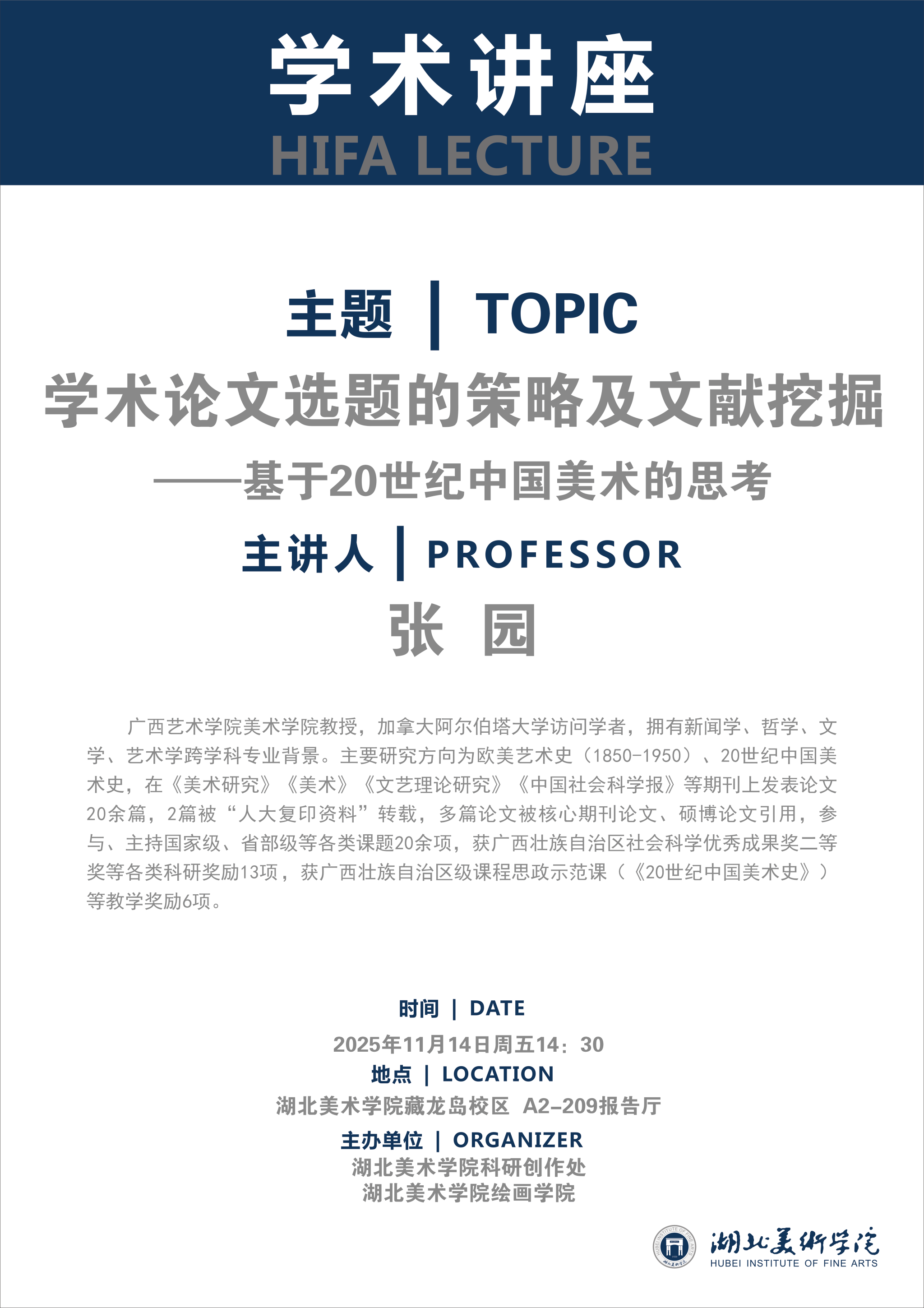 2025年11月14日14:30,广西艺术公司美术公司教授张园应邀在威廉希尔A2-209开展讲座,主题为“学术论文选题的策略及文献挖掘——基于20世纪中国美术的思考”,威廉希尔williamhill师生现场聆听讲座,讲座由威廉希尔williamhill版画系第一工作室主任周浩老师主持。