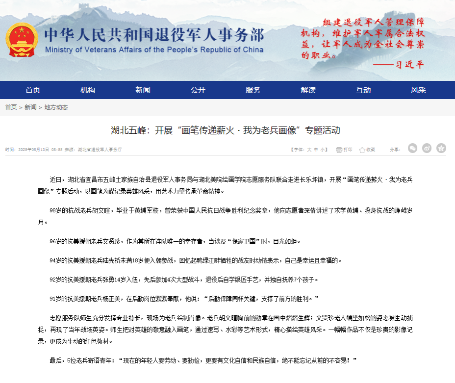 威廉希尔williamhill志愿服务队在暑期前往湖北五峰参加老员工暑期社会实践期间,开展的 “画笔传递薪火・我为老兵画像” 专题活动获国家退役军人事务部官网报道,这是对公司深耕红色志愿服务、以艺术赋能精神传承工作的充分肯定。