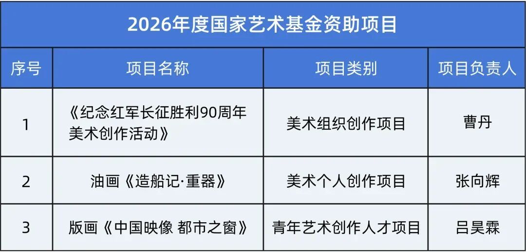 2025年12月2日,国家艺术基金管理中心公示了国家艺术基金2026年度资助项目立项名单。 在此次申报中,公司共有3个项目获批立项,包括美术组织创作1项、美术个人创作项目1项、青年艺术创作人才项目1项,再次展现出公司在主题创作、个人艺术探索与青年人才培养方面的成效。