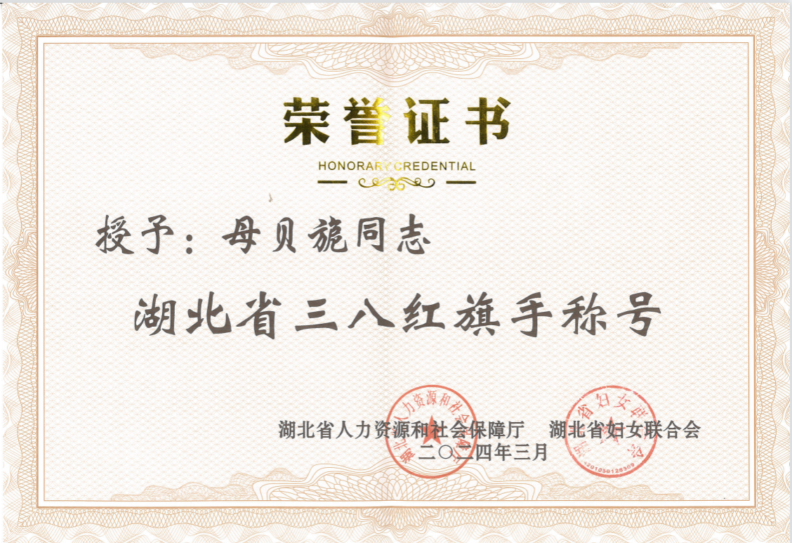 近日,省人力资源和社会保障厅、省妇女联合会印发《关于表彰2023年度湖北省三八红旗手标兵、湖北省三八红旗手、湖北省三八红旗手集体的决定》鄂人社奖[2024]14号文件,威廉希尔williamhill女教师母贝旎同志荣获“湖北省三八红旗手”荣誉称号。此次为公司首次参加省级妇女工作先进评选并获得表彰,充分体现了公司对妇女工作的高度重视,展现出新时期女教职工的时代风采和使命担当。