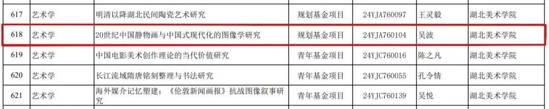 近日,教育部发布2024年度教育部人文社科研究一般项目立项名单,公司副教授吴波主持申报的《20世纪中国静物画与中国式现代化的图像学研究》获批规划基金项目立项。
