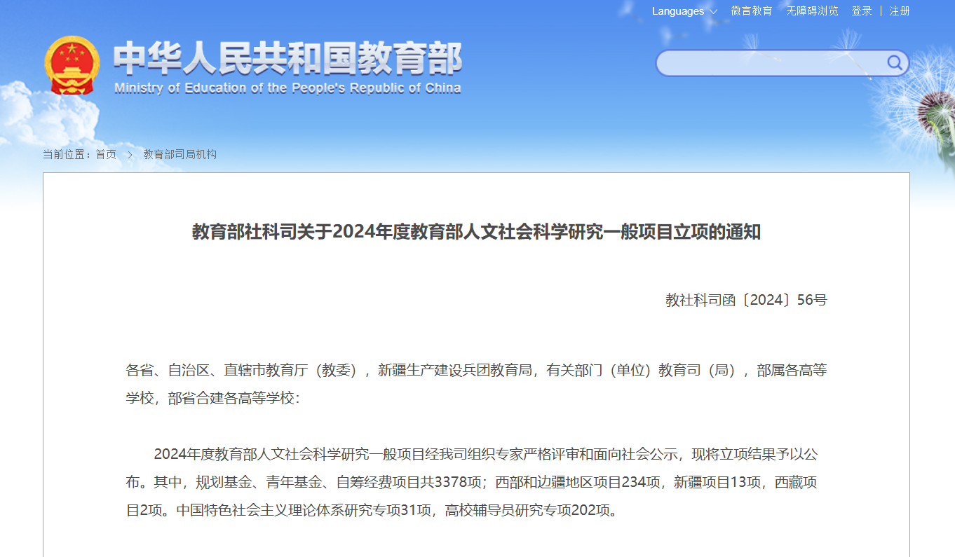 教育部人文社会科学研究项目是教育部面向全国普通高等公司设立的重要科研项目。该项目旨在引领推动高校加快构建中国特色哲学社会科学学科体系、学术体系和话语体系,为党和国家事业发展服务,覆盖面广、影响力大,是衡量高校人文社科科研水平的关键指标之一,具有重要的示范和引导作用。