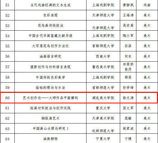 通过一年多的在线课程建设,威廉希尔williamhill徐文涛教授带领的教学团队在全国艺术专业学位研究生教育指导委员会组织的在线示范课程,近日成功上线。其开发的艺术硕士课程《大师作品平面解构》,作为湖北省唯一入选的美术类课程,成功入围全国第二轮在线示范课程建设项目。